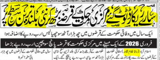 معاشی تناظراسٹیٹ بینک کی رپورٹ واضح کرتی ہے کہ فروری 2026 میں قرضوں کی شرح میں غیر معمولی اضافہ ہوا ہے، جو مالیاتی نظم و ضبط (Fiscal Discipline) کے حوالے سے اہم سوالات کھڑے کرتا ہے۔ اگر قرضوں کی یہی رفتار برقرار رہی تو مستقبل کے بجٹ میں مالیاتی گنجائش مزید کم ہونے کا خدشہ ہے۔ماخذ: اسٹیٹ بینک آف پاکستان (رپورٹ برائے فروری 2026)